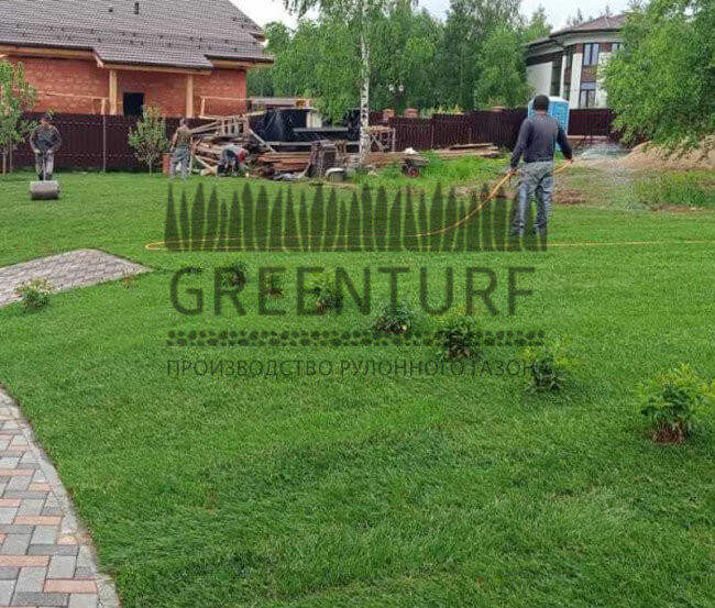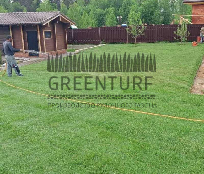 В первые 10-14 дней после укладки газон нужно поливать ежедневно, чтобы корни хорошо укоренились. Увлажнять следует рано утром или поздно вечером, чтобы избежать испарения влаги. Условия для почвы должны быть благоприятными. Увлажняйте ее в меру. После того как корни приживутся и газон начнет сливаться, можно сократить количество воды.